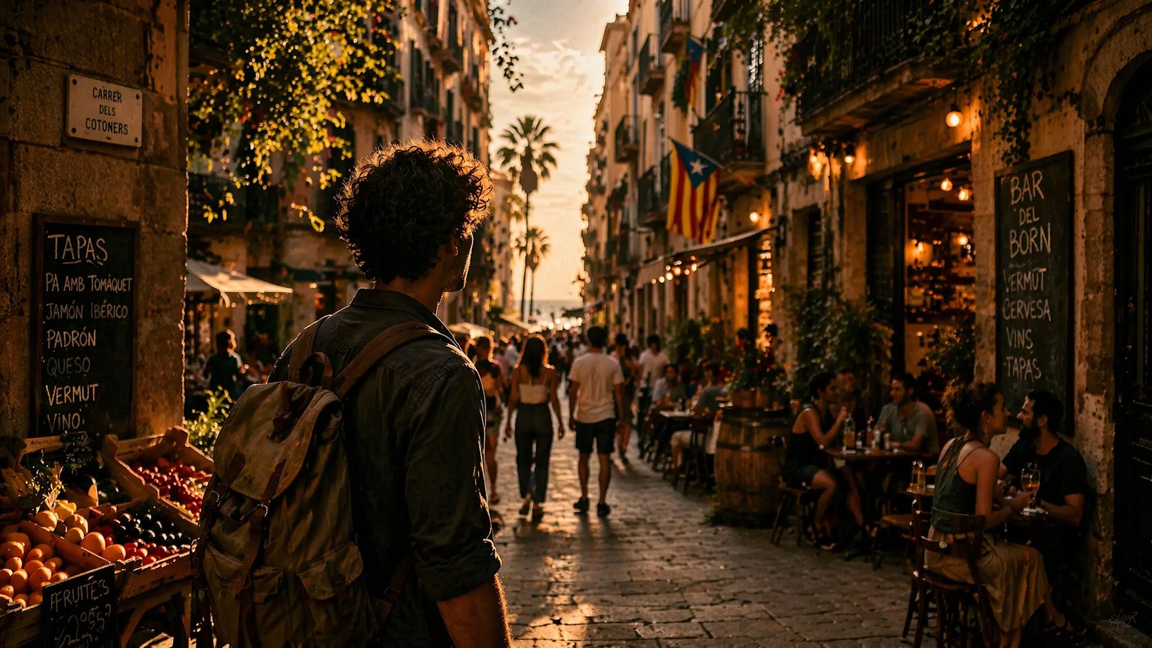 The streets fill up around you. Barcelona in the evening is a different city again — louder, warmer, more alive. You watch it happen from your table and feel that specific kind of contentment that only comes from a day well spent.