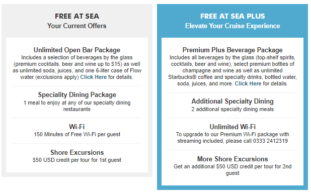All alcoholic beverages, sodas, bottled water, and specialty coffees: charged separately unless the Free at Sea package is selected