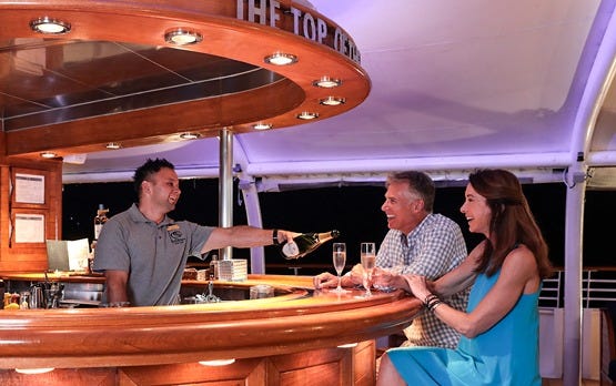 The Top of the Yacht Bar. Located at the highest point of the ship with 360-degree open-air views, the Top of the Yacht Bar is where evenings tend to begin and, frequently, where they end. With a maximum of 112 guests, the bar has the social atmosphere of a private party rather than a shipboard venue.