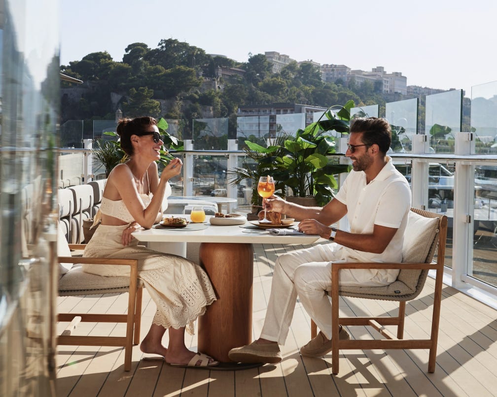 All suites across the fleet include Frette bath robes, the brand’s signature bath amenities, in-suite espresso machines, and daily service from a dedicated attendant. The terrace in every category functions as a genuine outdoor living space with lounge furniture rather than a token balcony.