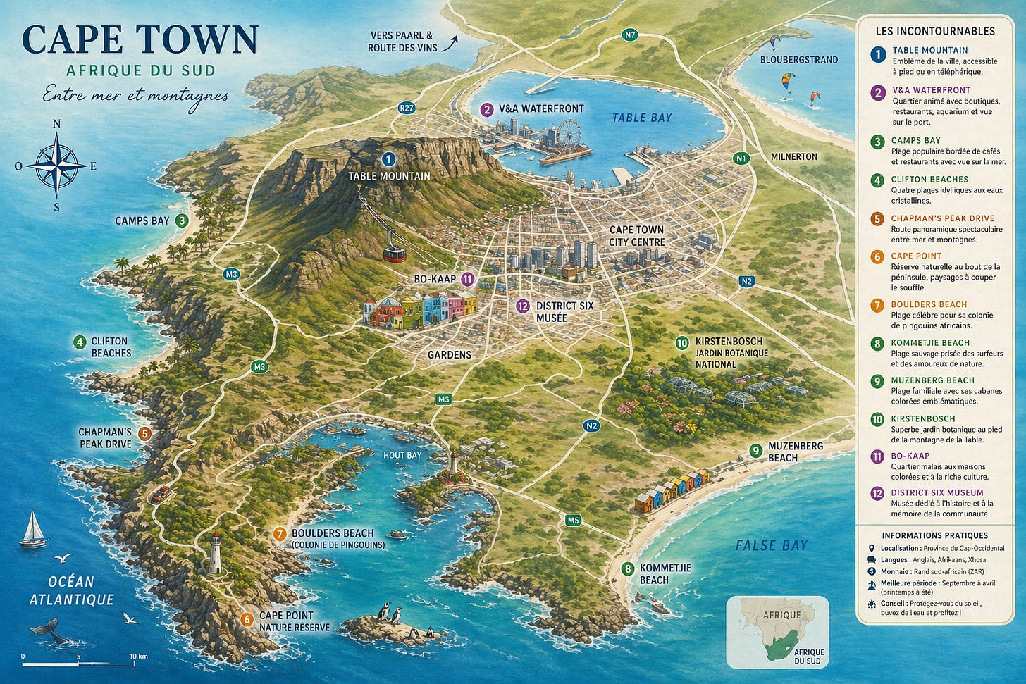 Safety: Cape Town requires more situational awareness than most European cities. Stay alert in the CBD after dark; use Uber rather than walking to your accommodation at night; do not display expensive cameras or phones in crowded areas. The main tourist areas are generally safe by day. Ask your hotel for current advice on specific streets.