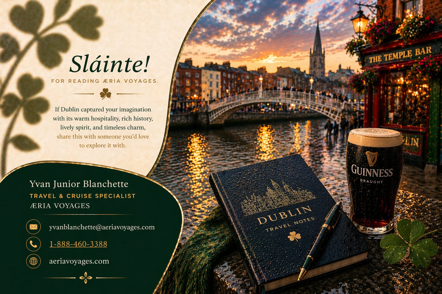 Every traveler’s ideal Dublin itinerary looks different depending on the time available, the history that resonates most, and whether Dublin is the destination or the starting point for a broader Ireland adventure. I help clients build trips that go beyond the standard circuit: a private literary tour of Joycean Dublin, a curated Irish whiskey tasting at the finest distilleries, a self-drive circuit of the Wild Atlantic Way beginning and ending in Dublin, or a cruise itinerary that includes Dublin and the Irish coastline.
